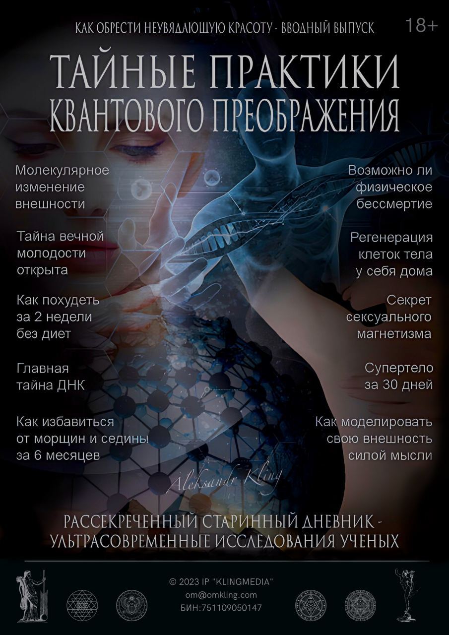 Эта технология призвана сделать мировой переворот в индустрии омоложения, красоты и изменения внешности. Из вводной бесплатной части книги вы узнаете о сакральных методах омоложения, неопубликованные в других источниках, утраченном рецепте эликсира вечной юности, регенерации клеток тела, практиках изменения внешности, квантовой трансформации внешности и многое другое...